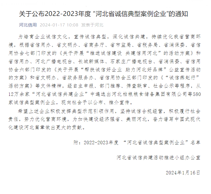 2024年1月16日,河北省誠信共建活動推進小組辦公室公布了2022-2023年度“河北省誠信典型案例企業”名單,邯鄲市禾下土種業有限公司等580家誠信企業入選。