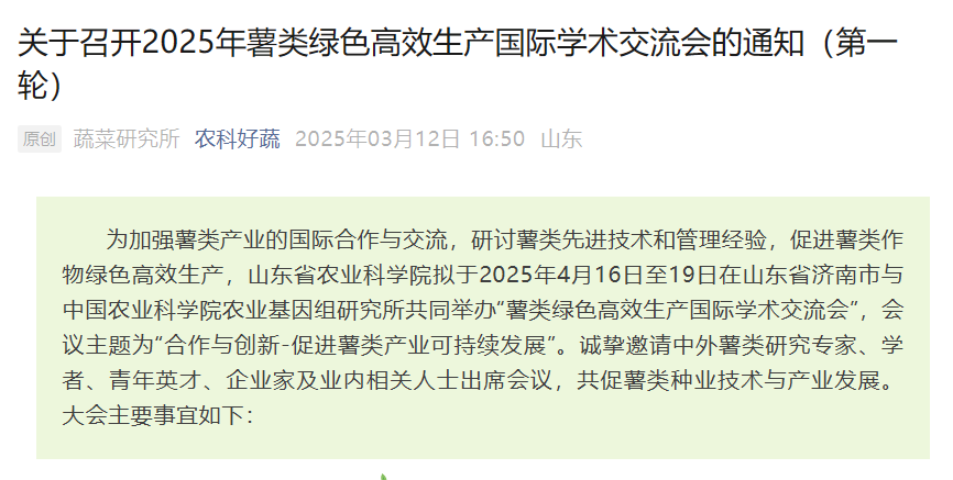 為加強薯類產業的國際合作與交流,研討薯類先進技術和管理經驗,促進薯類作物綠色高效生產,山東省農業科學院擬于2025年4月16日至19日在山東省濟南市與中國農業科學院農業基因組研究所共同舉辦“薯類綠色高效生產國際學術交流會”。會議以“合作與創新-促進薯類產業可持續發展”為主題,將邀請國內外從事薯類研究的院士、體系首席、專家、重點企業負責人及其他相關人士;山東省人民政府、科學技術廳、農業農村廳等相關部門領導出席。圍繞全球雜交馬鈴薯聯盟(GHPA)專題研討、馬鈴薯綠色高效生產、甘薯綠色高效生產等三大主要議題開展交流研討,共促薯類種業技術與產業發展。會議時間:2025年4月16日-19日4月16日:全天報到4月17-18日:開幕式、專家報告4月18日下午:前往觀摩現場4月19日上午:觀摩滕州馬鈴薯、泗水甘薯生產基地4月19...