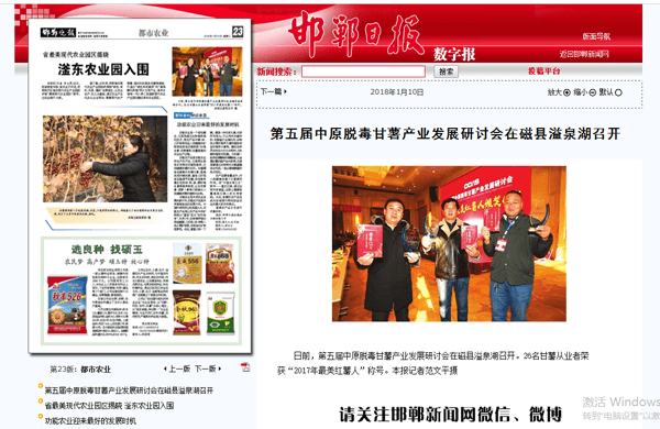 2018年1月8日,第五屆中原脫毒甘薯產業發展研討會在河北磁縣溢泉湖隆重舉行。得到各大報紙、網絡媒體的關注。本次研討會特別邀請國家甘薯產業技術體系首席專家馬代夫、山東省煙臺市農科院甘薯研究所所長、煙薯25育種人辛國勝、河北省農林科學院糧油作物研究所主任馬志民、龍薯9號育種人楊立明,及來自國內24個省市的優秀甘薯種植戶、育苗單位、農資企業、機械廠家、甘薯加工、銷售企業代表共300余人出席參加。為國內甘薯企業、種植戶在種苗培育、品種選擇、安全生產、貯藏銷售、精深加工、產業合作等方面創新了發展新思路,為進一步加快脫毒甘薯產業化推廣,推動中國脫毒甘薯產業的健康發展發揮了重要的作用。