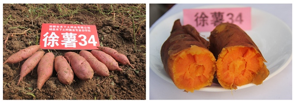 該品種赭紅皮桔紅肉,長紡錘形,蒸煮、生食口感好,許多地方已進行精包裝進超市,市民也把它作為一種禮品贈送親朋好友。徐薯34比一般的甘薯品種早熟20~30天,能早收早上市,彌補市場空缺,經(jīng)濟效益高,特別適宜城郊地區(qū)發(fā)展。